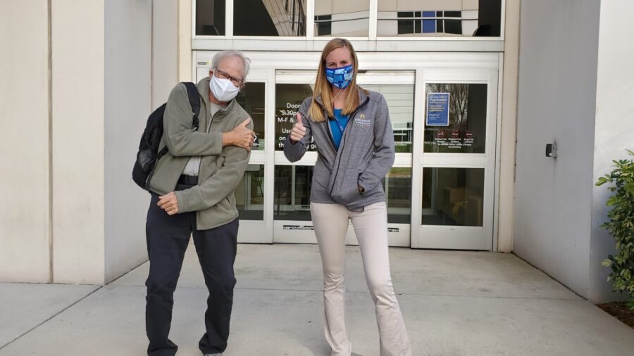 My vaccine was scheduled for the following day. Kenny walked the 2.5 miles with me. It was a hot afternoon and we tried to get an Uber, but without success, so we just kept walking. My appointment was at the Center for Health Equity, and they ran a tight organized ship. I queued up outside the building at 2:50 p.m. and at 3:15 I was back on the street at Kenny’s side, feeling grateful. I bet they vaccinated a thousand people that day. Then we walked all the way back to Gulfport, because Uber rates were surging. We couldn’t bare paying $36 to go 2.5 miles.