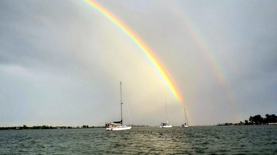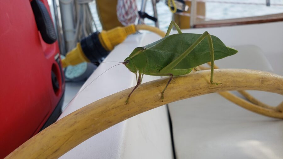 The only other visitors we had were some frisky dolphins who swam over to play in our bow wake and a katydid or “leaf bug” that landed in our cockpit in the Bradenton anchorage. I captured both on video. (Katy and the generator) I didn’t know it was possible to feel such affection for a member of the insect family, but “Katy” as we called her, truly won our hearts. She moved with such grace and care. I couldn’t bare the idea of her ending in a watery grave, because katydids can barely fly. It must have been the wind that carried her all the way out to our anchored boat. I coaxed her into a yogurt container in which I put some arugula to tide her over until we could bring her ashore in the dinghy. She showed no interest in the arugula. In fact, she couldn’t get far enough away from it (like other members of the crew), and seemed rather anxious to escape her little prison. Kenny couldn’t stand to see Katy in that state for another moment, so he rowed her ashore and released her into the mangroves. While on his mission, a spectacular double rainbow arched over Mary T, and Kenny captured it perfectly. (see photo above) What an auspicious moment for Katy’s release. We thought of her on subsequent walks in De Soto Park, but our paths haven’t crossed.