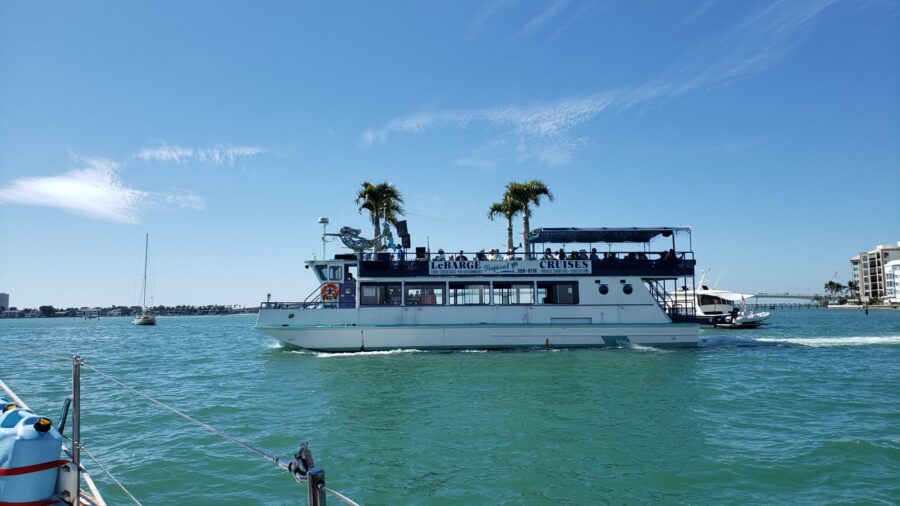 Mary T behaved well throughout our trips up and down the coast, except for a couple of mishaps when the engine died. In warm climates organisms sometimes grow on the inside of the fuel tank. Eventually they break off into the diesel and wind up in the filters, clogging them and preventing the fuel from getting to the engine. On the day we departed Sarasota the engine died 500 meters from the mooring field. We attempted to sail back to the mooring, but wind and current were against us. We dropped the anchor just outside of the mooring field and called for a tow. I was a nervous wreck the whole time, because I didn’t think the anchor was holding and we appeared to be drifting closer to the bridge. I was much relieved when the towboat arrived and returned us to our mooring. Kenny spent the next couple of hours changing the filters and then bleeding the engine to remove any air bubbles from the system. It was cause for jubilation, when the engine purred to life again. It was too late at that point to go anywhere, so we spent one more night in Sarasota.