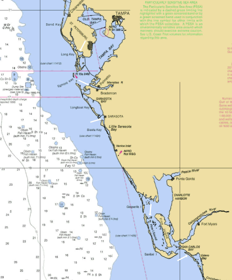Mid Gulf Coast Florida–the white arrows indicate anchorages in Gulfport, DeSoto Park, Sarasota, Useppa Island and Fort Meyers Beach,