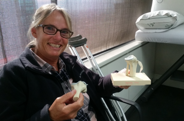 Finally it was time for the big appointment. Sitting in the reception area, I started to get nervous. What if the doctor told me I’d need some kind of surgery? The idea filled me with dread. The paperwork was mercifully short and we were ushered into Dr. Collia’s office to wait some more. A small plastic model of a knee sat behind the sheer blind on the window sill. I picked it up and started to play with it, when it came apart in two pieces. It looked simple enough, but I couldn’t put it back together. “Now look what you’ve done,” Kenny mocked. Suddenly I got a horrible case of the giggles trying to put the damn thing back together. First time in the office and I was already destroying the property. Tears of laughter rolled down my cheeks. Eventually I managed to get the two pieces back together. It really wasn’t broken, just a flimsy model.