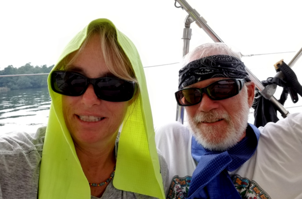 Being at anchor is such a liberating feeling after living at a marina for so long. It was pretty steamy so, we soaked in the river with floaties drinking bears. Later, we hit Texan Mike’s restaurant for an early dinner of basic burgers. Mike eventually appeared to greet us and held court at a large table with a bunch of fellow Texans who just sailed in. I felt like I was in the Lone Star state. On our dinghy ride back to Mary T an otter swam by.