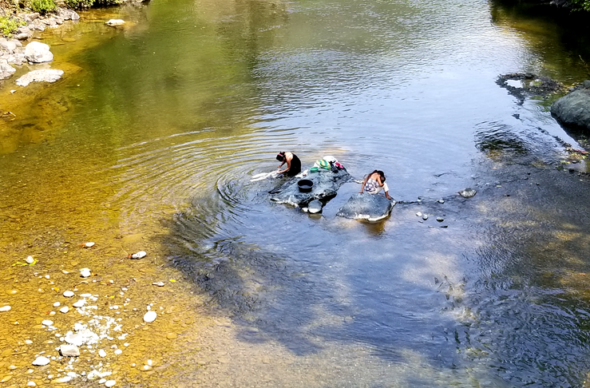 We set off in our life jackets with a guide, giant inner tubes in tow. Since I was still pretty gimpy, the guide carried my tube and stayed near me for the 3/4 kilometer hike up and down a trail through the jungle to the spot where we’d enter the river. It was a bit more arduous than I’d anticipated, but my knee held up. The others were patient with my pace. (We’ll she ever get over that knee thing?) Sometimes if the guide wasn’t nearby, the driver’s ten-year-old son, would take my hand over the rough spots. I melted. By the time we reached the put-in point I was drenched with sweat. The cool, clear water felt divine. Floating gently down stream through a rocky canyon with locals on holiday, swimming, tubing and kayaking was pretty darn swell. This was not a hardship volunteer gig.